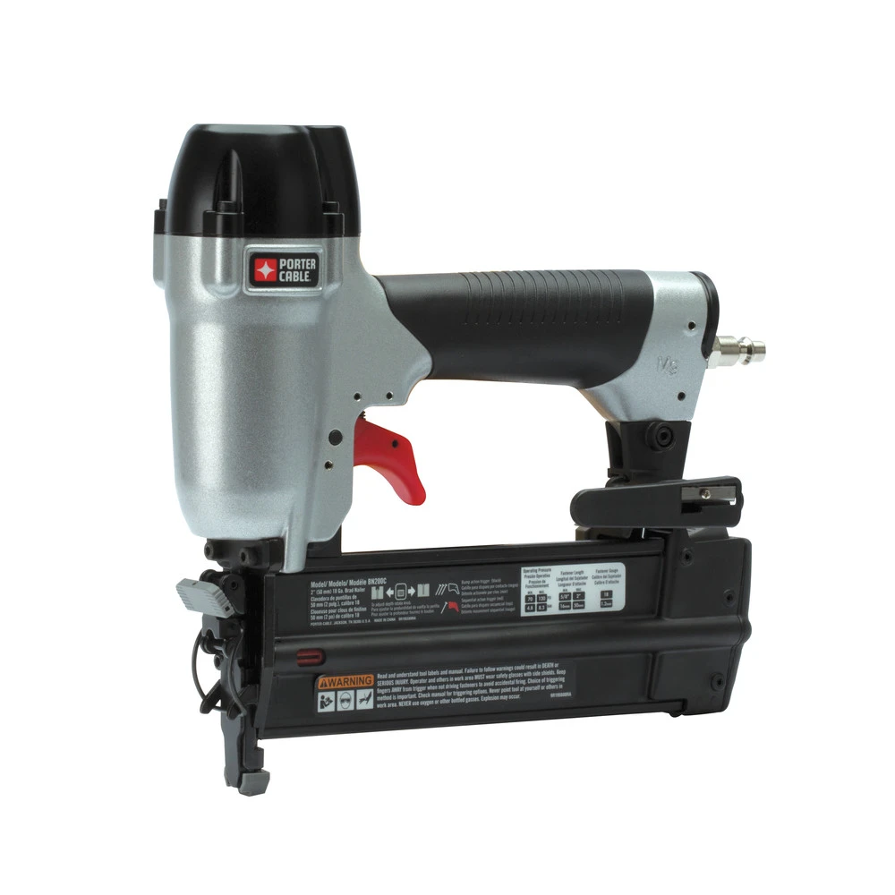 - With the Porter-Cable BN200C 18-Gauge 2 in. Brad Nailer Kit, you’ll be able to handle an array of different fastening tasks with easy-to-use nailer. It uses standard 18 gauge brad nails with an internal piston provides power and consistency though every shot. The BN200C has a tool-free nail depth adjustment and adjustable belt clip, alongside with a trigger lock-off switch.