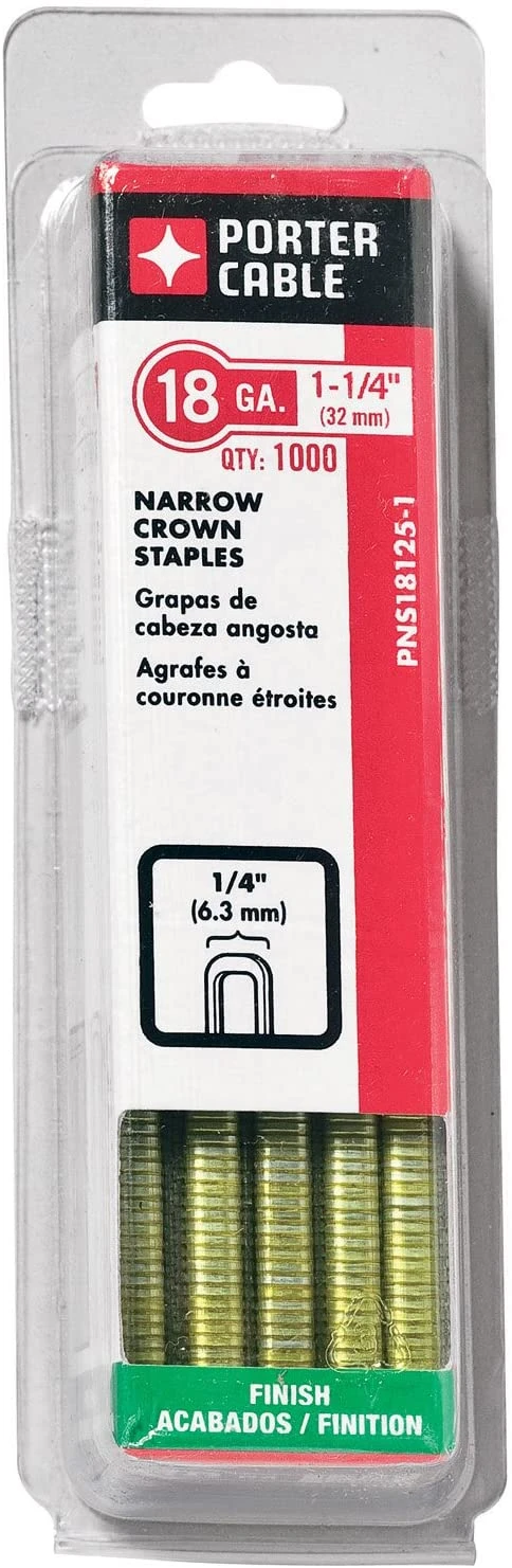 - Porter-Cable PNS18125-1 staples feature a 1-1/4-inch length and 18-gauge narrow crown design, ideal for precision fastening in woodworking, upholstery, and light construction tasks.